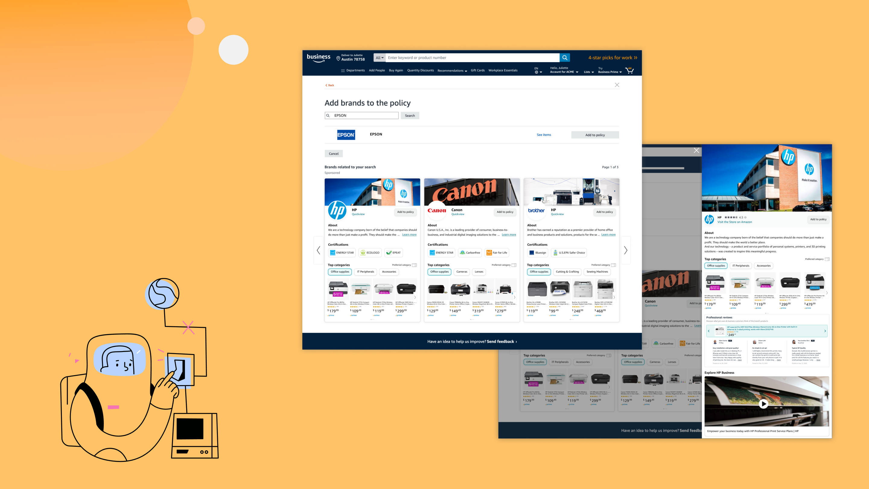 The administrator of an Amazon Business account can set buying policies to block, prefer or restrict purchase at the order, seller or product level. Subsequently, any shopper from that admin’s organization will have augmented search result like badged and highlighted results for preferred and restricted & no result for blocked.